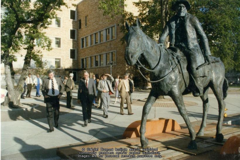 | Description: | Invited guests are walking towards the Gabriel Dumont statue at Saskatoon City Hall. On May 14, 1985, the Gabriel Dumont statute was taken to Saskatoon City Hall and those in attendance included Bill Epp, Dennis and Jean Fisher, Donna Birkmairier, Howard Nixon, and Métis leader, Clarence Trotchie. Earlier on May 6, 1985, there was a ceremony to honour Gabriel Dumont in Saskatoon. Events included the unveiling of the Gabriel Dumont stamp and first-day cover by Canada Post, the dedication of the Gabriel Dumont Statue and Park, jigging and square dancing by the Gabriel Dumont Dancers, and the official opening of the Marr Residence. This folder contains images relating to the commemoration of Gabriel Dumont during the centenary of the 1885 Resistance. This album (#12 in Dennis Fisher`s Photo Collection) centres around sculptor Bill Epp making the Gabriel Dumont statute in his studio in New Mexico; Dennis and Jean Fisher visiting Epp in his studio; the Fishers and Epp taking the statue to the Dumont family reunion in the summer of 1885; the Fishers and Epp taking the statue to Saskatoon for public display; and having it unveiled on a day of tribute to Gabriel Dumont on May 6, 1985 in Saskatoon. The Gabriel Dumont Statue was originally to be placed in the newly-created Gabriel Dumont Park; however, it permanently rests in Friendship Park in Saskatoon.