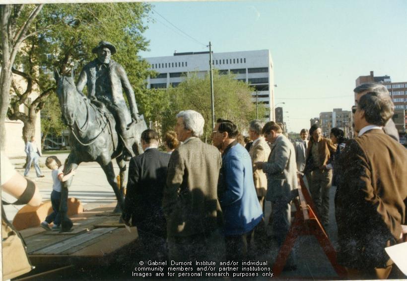 | Description: | People gather before the Gabriel Dumont statue at Saskatoon City Hall. On May 14, 1985, the Gabriel Dumont statute was taken to Saskatoon City Hall and those in attendance included Bill Epp, Dennis and Jean Fisher, Donna Birkmairier, Howard Nixon, and Métis leader, Clarence Trotchie. Earlier on May 6, 1985, there was a ceremony to honour Gabriel Dumont in Saskatoon. Events included the unveiling of the Gabriel Dumont stamp and first-day cover by Canada Post, the dedication of the Gabriel Dumont Statue and Park, jigging and square dancing by the Gabriel Dumont Dancers, and the official opening of the Marr Residence. This folder contains images relating to the commemoration of Gabriel Dumont during the centenary of the 1885 Resistance. This album (#12 in Dennis Fisher`s Photo Collection) centres around sculptor Bill Epp making the Gabriel Dumont statute in his studio in New Mexico; Dennis and Jean Fisher visiting Epp in his studio; the Fishers and Epp taking the statue to the Dumont family reunion in the summer of 1885; the Fishers and Epp taking the statue to Saskatoon for public display; and having it unveiled on a day of tribute to Gabriel Dumont on May 6, 1985 in Saskatoon. The Gabriel Dumont Statue was originally to be placed in the newly-created Gabriel Dumont Park; however, it permanently rests in Friendship Park in Saskatoon.