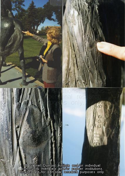 | Description: | In this image, which has four panels, Jean Fisher indicates where Bill Epp left his fingerprint on the Gabriel Dumont statue. On May 14, 1985, the Gabriel Dumont statute was taken to Saskatoon City Hall and those in attendance included Bill Epp, Dennis and Jean Fisher, Donna Birkmairier, Howard Nixon, and Métis leader, Clarence Trotchie. Earlier on May 6, 1985, there was a ceremony to honour Gabriel Dumont in Saskatoon. Events included the unveiling of the Gabriel Dumont stamp and first-day cover by Canada Post, the dedication of the Gabriel Dumont Statue and Park, jigging and square dancing by the Gabriel Dumont Dancers, and the official opening of the Marr Residence. This folder contains images relating to the commemoration of Gabriel Dumont during the centenary of the 1885 Resistance. This album (#12 in Dennis Fisher`s Photo Collection) centres around sculptor Bill Epp making the Gabriel Dumont statute in his studio in New Mexico; Dennis and Jean Fisher visiting Epp in his studio; the Fishers and Epp taking the statue to the Dumont family reunion in the summer of 1885; the Fishers and Epp taking the statue to Saskatoon for public display; and having it unveiled on a day of tribute to Gabriel Dumont on May 6, 1985 in Saskatoon. The Gabriel Dumont Statue was originally to be placed in the newly-created Gabriel Dumont Park; however, it permanently rests in Friendship Park in Saskatoon.