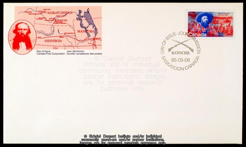 This image (by Peter Beszterda) is of a first day cover of the Gabriel Dumont stamp from 1985. This item is part of the Dennis and Jean Fisher Collection. This collection contains archaeological artifacts taken from the battlefields of the 1885 Resistance as well as Fort Pitt (Saskatchewan), Cumberland House (Saskatchewan) and St. Peter’s Mission, Montana. The collection also includes various artifacts and ephemera relating to the 1885 Resistance and Gabriel Dumont. |