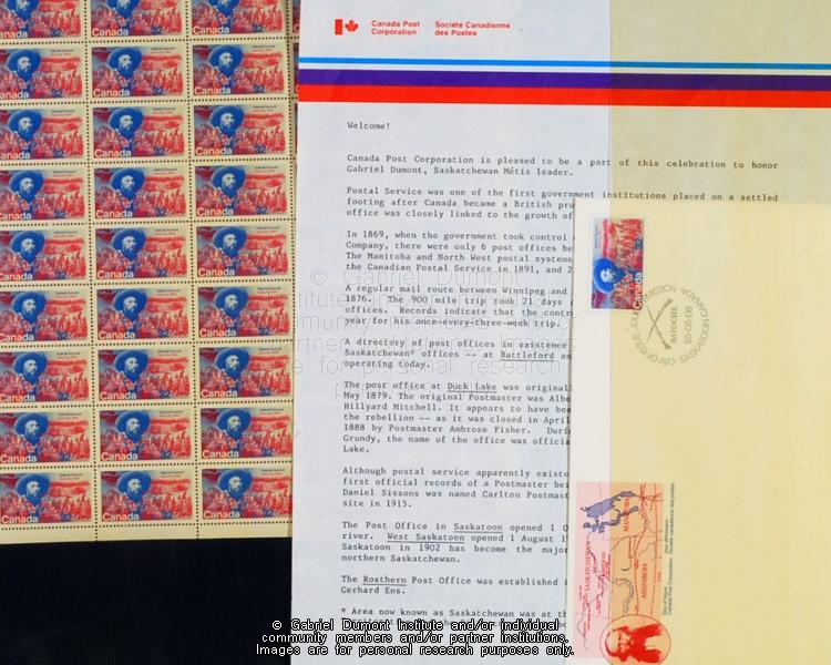 This image (by Peter Beszterda) is of the contents of a stamp album for the Gabriel Dumont stamp that was issued in 1985. This item is part of the Dennis and Jean Fisher Collection. This collection contains archaeological artifacts taken from the battlefields of the 1885 Resistance as well as Fort Pitt (Saskatchewan), Cumberland House (Saskatchewan) and St. Peter’s Mission, Montana. The collection also includes various artifacts and ephemera relating to the 1885 Resistance and Gabriel Dumont. |