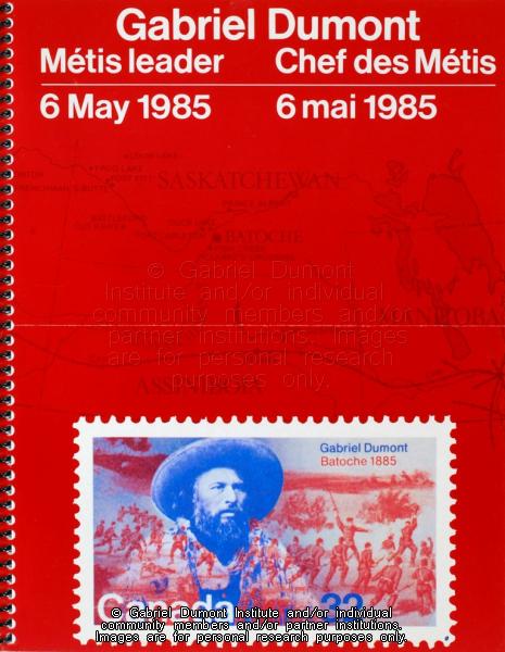 | Description: | This image is of the poster of the Gabriel Dumont stamp that was issued in 1985. In 1999, Dennis Fisher put together this album and entitled it the ``Gabriel Dumont Album.`` The album largely focuses on items relating to Gabriel Dumont such as Dennis and Bill Epp`s correspondence regarding the creation of the Gabriel Dumont statue, Dennis`s finding of a ``lost`` image of Gabriel Dumont at the Buffalo Bill Cody Museum in Wyoming, information relating to an image of Dumont in a Wild West show program; a document in which Dumont attempts to write his name, a chronology of Dumont`s life, a program relating to the closing of Gabriel`s Ferry, various images relating the Commemorate `85 Celebrations in Saskatoon which honoured Gabriel Dumont, as well as facsimiles of Dumont`s stamp, and a pamphlet by Agriculture Canada promoting ``Dumont Oats.`` Other items relate to Madeleine Dumont`s grave in Montana as well as information about Louis Riel including a timeline of his life, and information relating to the acquisition of his diary by Dennis Fisher and Eugène Rhéaume.