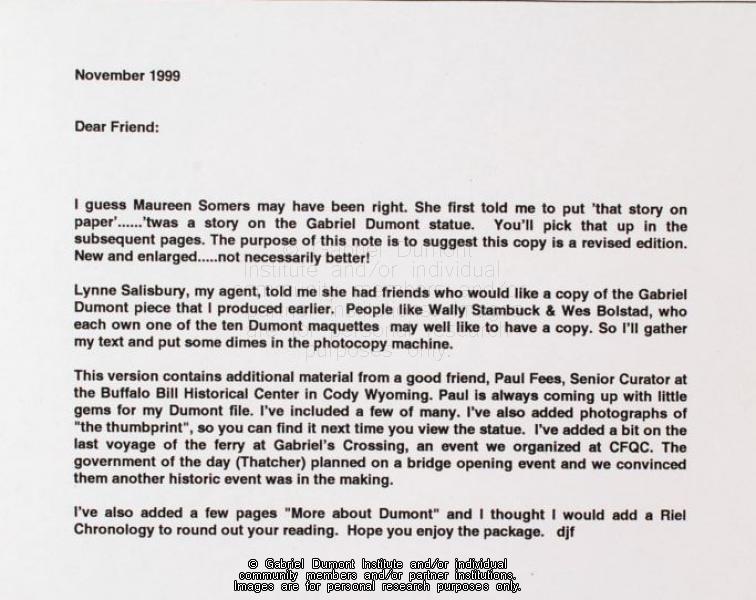 | Description: | In this image, Dennis Fisher introduces readers to the contents of this album. In 1999, Dennis Fisher put together this album and entitled it the ``Gabriel Dumont Album.`` The album largely focuses on items relating to Gabriel Dumont such as Dennis and Bill Epp`s correspondence regarding the creation of the Gabriel Dumont statue, Dennis`s finding of a ``lost`` image of Gabriel Dumont at the Buffalo Bill Cody Museum in Wyoming, information relating to an image of Dumont in a Wild West show program; a document in which Dumont attempts to write his name, a chronology of Dumont`s life, a program relating to the closing of Gabriel`s Ferry, various images relating the Commemorate `85 Celebrations in Saskatoon which honoured Gabriel Dumont, as well as facsimiles of Dumont`s stamp, and a pamphlet by Agriculture Canada promoting ``Dumont Oats.`` Other items relate to Madeleine Dumont`s grave in Montana as well as information about Louis Riel including a timeline of his life, and information relating to the acquisition of his diary by Dennis Fisher and Eugène Rhéaume.