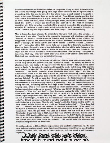 | Description: | In this image, Dennis Fisher writes about working with sculptor Bill Epp to make a statue for Gabriel Dumont in Saskatoon. In 1999, Dennis Fisher put together this album and entitled it the ``Gabriel Dumont Album.`` The album largely focuses on items relating to Gabriel Dumont such as Dennis and Bill Epp`s correspondence regarding the creation of the Gabriel Dumont statue, Dennis`s finding of a ``lost`` image of Gabriel Dumont at the Buffalo Bill Cody Museum in Wyoming, information relating to an image of Dumont in a Wild West show program; a document in which Dumont attempts to write his name, a chronology of Dumont`s life, a program relating to the closing of Gabriel`s Ferry, various images relating the Commemorate `85 Celebrations in Saskatoon which honoured Gabriel Dumont, as well as facsimiles of Dumont`s stamp, and a pamphlet by Agriculture Canada promoting ``Dumont Oats.`` Other items relate to Madeleine Dumont`s grave in Montana as well as information about Louis Riel including a timeline of his life, and information relating to the acquisition of his diary by Dennis Fisher and Eugène Rhéaume.