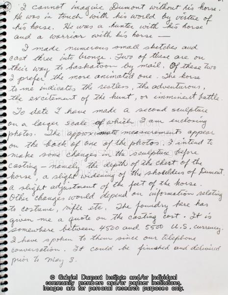| Description: | In this image, sculptor Bill Epp writes to Dennis Fisher about the process of making a Gabriel Dumont statue. In 1999, Dennis Fisher put together this album and entitled it the ``Gabriel Dumont Album.`` The album largely focuses on items relating to Gabriel Dumont such as Dennis and Bill Epp`s correspondence regarding the creation of the Gabriel Dumont statue, Dennis`s finding of a ``lost`` image of Gabriel Dumont at the Buffalo Bill Cody Museum in Wyoming, information relating to an image of Dumont in a Wild West show program; a document in which Dumont attempts to write his name, a chronology of Dumont`s life, a program relating to the closing of Gabriel`s Ferry, various images relating the Commemorate `85 Celebrations in Saskatoon which honoured Gabriel Dumont, as well as facsimiles of Dumont`s stamp, and a pamphlet by Agriculture Canada promoting ``Dumont Oats.`` Other items relate to Madeleine Dumont`s grave in Montana as well as information about Louis Riel including a timeline of his life, and information relating to the acquisition of his diary by Dennis Fisher and Eugène Rhéaume.
