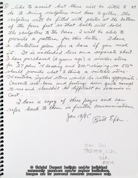 | Description: | In this image, sculptor Bill Epp writes to Dennis Fisher about the process of making a Gabriel Dumont statue. In 1999, Dennis Fisher put together this album and entitled it the ``Gabriel Dumont Album.`` The album largely focuses on items relating to Gabriel Dumont such as Dennis and Bill Epp`s correspondence regarding the creation of the Gabriel Dumont statue, Dennis`s finding of a ``lost`` image of Gabriel Dumont at the Buffalo Bill Cody Museum in Wyoming, information relating to an image of Dumont in a Wild West show program; a document in which Dumont attempts to write his name, a chronology of Dumont`s life, a program relating to the closing of Gabriel`s Ferry, various images relating the Commemorate `85 Celebrations in Saskatoon which honoured Gabriel Dumont, as well as facsimiles of Dumont`s stamp, and a pamphlet by Agriculture Canada promoting ``Dumont Oats.`` Other items relate to Madeleine Dumont`s grave in Montana as well as information about Louis Riel including a timeline of his life, and information relating to the acquisition of his diary by Dennis Fisher and Eugène Rhéaume.