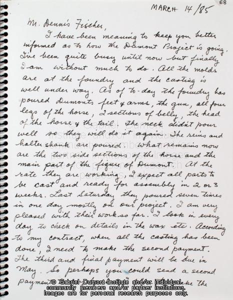 | Description: | In this image, sculptor Bill Epp writes to Dennis Fisher about the process of making a Gabriel Dumont statue. In 1999, Dennis Fisher put together this album and entitled it the ``Gabriel Dumont Album.`` The album largely focuses on items relating to Gabriel Dumont such as Dennis and Bill Epp`s correspondence regarding the creation of the Gabriel Dumont statue, Dennis`s finding of a ``lost`` image of Gabriel Dumont at the Buffalo Bill Cody Museum in Wyoming, information relating to an image of Dumont in a Wild West show program; a document in which Dumont attempts to write his name, a chronology of Dumont`s life, a program relating to the closing of Gabriel`s Ferry, various images relating the Commemorate `85 Celebrations in Saskatoon which honoured Gabriel Dumont, as well as facsimiles of Dumont`s stamp, and a pamphlet by Agriculture Canada promoting ``Dumont Oats.`` Other items relate to Madeleine Dumont`s grave in Montana as well as information about Louis Riel including a timeline of his life, and information relating to the acquisition of his diary by Dennis Fisher and Eugène Rhéaume.