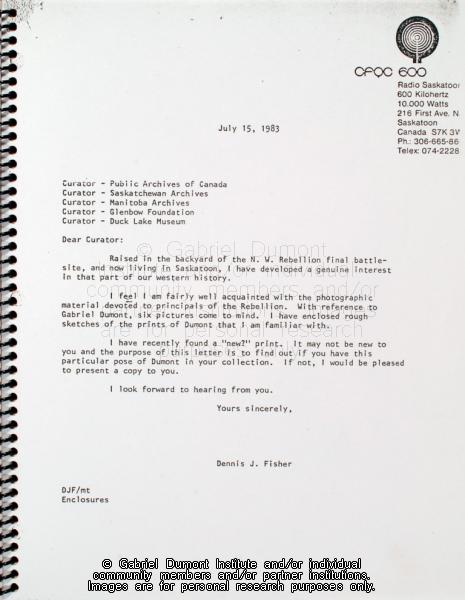 | Description: | In this image, Dennis Fisher writes to various archives to see if they would like a copy of the ``lost`` Gabriel Dumont image from the Buffalo Bill Interpretive Center in Cody Wyoming. In 1999, Dennis Fisher put together this album and entitled it the ``Gabriel Dumont Album.`` The album largely focuses on items relating to Gabriel Dumont such as Dennis and Bill Epp`s correspondence regarding the creation of the Gabriel Dumont statue, Dennis`s finding of a ``lost`` image of Gabriel Dumont at the Buffalo Bill Cody Museum in Wyoming, information relating to an image of Dumont in a Wild West show program; a document in which Dumont attempts to write his name, a chronology of Dumont`s life, a program relating to the closing of Gabriel`s Ferry, various images relating the Commemorate `85 Celebrations in Saskatoon which honoured Gabriel Dumont, as well as facsimiles of Dumont`s stamp, and a pamphlet by Agriculture Canada promoting ``Dumont Oats.`` Other items relate to Madeleine Dumont`s grave in Montana as well as information about Louis Riel including a timeline of his life, and information relating to the acquisition of his diary by Dennis Fisher and Eugène Rhéaume.