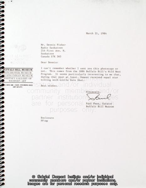 | Description: | In this image, Paul Fees, Curator of the Buffalo Bill Museum, describes a program he found which contains an image and biography of Gabriel Dumont. In 1999, Dennis Fisher put together this album and entitled it the ``Gabriel Dumont Album.`` The album largely focuses on items relating to Gabriel Dumont such as Dennis and Bill Epp`s correspondence regarding the creation of the Gabriel Dumont statue, Dennis`s finding of a ``lost`` image of Gabriel Dumont at the Buffalo Bill Cody Museum in Wyoming, information relating to an image of Dumont in a Wild West show program; a document in which Dumont attempts to write his name, a chronology of Dumont`s life, a program relating to the closing of Gabriel`s Ferry, various images relating the Commemorate `85 Celebrations in Saskatoon which honoured Gabriel Dumont, as well as facsimiles of Dumont`s stamp, and a pamphlet by Agriculture Canada promoting ``Dumont Oats.`` Other items relate to Madeleine Dumont`s grave in Montana as well as information about Louis Riel including a timeline of his life, and information relating to the acquisition of his diary by Dennis Fisher and Eugène Rhéaume.