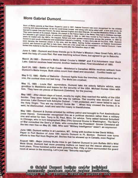 | Description: | In this image, Dennis Fisher provides a brief biographical sketch about the life of Gabriel Dumont. In 1999, Dennis Fisher put together this album and entitled it the ``Gabriel Dumont Album.`` The album largely focuses on items relating to Gabriel Dumont such as Dennis and Bill Epp`s correspondence regarding the creation of the Gabriel Dumont statue, Dennis`s finding of a ``lost`` image of Gabriel Dumont at the Buffalo Bill Cody Museum in Wyoming, information relating to an image of Dumont in a Wild West show program; a document in which Dumont attempts to write his name, a chronology of Dumont`s life, a program relating to the closing of Gabriel`s Ferry, various images relating the Commemorate `85 Celebrations in Saskatoon which honoured Gabriel Dumont, as well as facsimiles of Dumont`s stamp, and a pamphlet by Agriculture Canada promoting ``Dumont Oats.`` Other items relate to Madeleine Dumont`s grave in Montana as well as information about Louis Riel including a timeline of his life, and information relating to the acquisition of his diary by Dennis Fisher and Eugène Rhéaume.