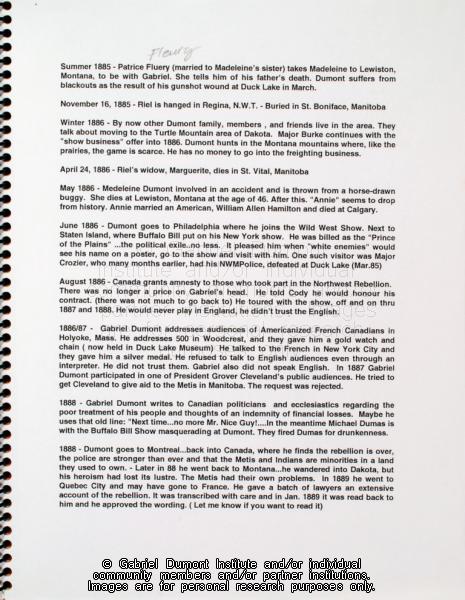 | Description: | In this image, Dennis Fisher provides a brief biographical sketch about the life of Gabriel Dumont. In 1999, Dennis Fisher put together this album and entitled it the ``Gabriel Dumont Album.`` The album largely focuses on items relating to Gabriel Dumont such as Dennis and Bill Epp`s correspondence regarding the creation of the Gabriel Dumont statue, Dennis`s finding of a ``lost`` image of Gabriel Dumont at the Buffalo Bill Cody Museum in Wyoming, information relating to an image of Dumont in a Wild West show program; a document in which Dumont attempts to write his name, a chronology of Dumont`s life, a program relating to the closing of Gabriel`s Ferry, various images relating the Commemorate `85 Celebrations in Saskatoon which honoured Gabriel Dumont, as well as facsimiles of Dumont`s stamp, and a pamphlet by Agriculture Canada promoting ``Dumont Oats.`` Other items relate to Madeleine Dumont`s grave in Montana as well as information about Louis Riel including a timeline of his life, and information relating to the acquisition of his diary by Dennis Fisher and Eugène Rhéaume.