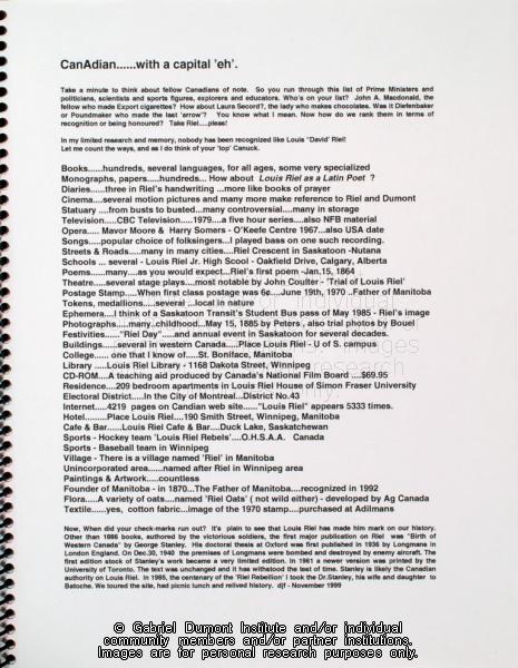 | Description: | In this image, Dennis Fisher writes about some of the ways that Louis Riel has been commemorated in Canada. In 1999, Dennis Fisher put together this album and entitled it the ``Gabriel Dumont Album.`` The album largely focuses on items relating to Gabriel Dumont such as Dennis and Bill Epp`s correspondence regarding the creation of the Gabriel Dumont statue, Dennis`s finding of a ``lost`` image of Gabriel Dumont at the Buffalo Bill Cody Museum in Wyoming, information relating to an image of Dumont in a Wild West show program; a document in which Dumont attempts to write his name, a chronology of Dumont`s life, a program relating to the closing of Gabriel`s Ferry, various images relating the Commemorate `85 Celebrations in Saskatoon which honoured Gabriel Dumont, as well as facsimiles of Dumont`s stamp, and a pamphlet by Agriculture Canada promoting ``Dumont Oats.`` Other items relate to Madeleine Dumont`s grave in Montana as well as information about Louis Riel including a timeline of his life, and information relating to the acquisition of his diary by Dennis Fisher and Eugène Rhéaume.