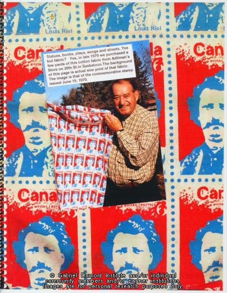 | Description: | In this image, Dennis Fisher is shown holding a piece of Louis Riel stamp fabric in 1979, and he also discusses finding the fabric. In 1999, Dennis Fisher put together this album and entitled it the ``Gabriel Dumont Album.`` The album largely focuses on items relating to Gabriel Dumont such as Dennis and Bill Epp`s correspondence regarding the creation of the Gabriel Dumont statue, Dennis`s finding of a ``lost`` image of Gabriel Dumont at the Buffalo Bill Cody Museum in Wyoming, information relating to an image of Dumont in a Wild West show program; a document in which Dumont attempts to write his name, a chronology of Dumont`s life, a program relating to the closing of Gabriel`s Ferry, various images relating the Commemorate `85 Celebrations in Saskatoon which honoured Gabriel Dumont, as well as facsimiles of Dumont`s stamp, and a pamphlet by Agriculture Canada promoting ``Dumont Oats.`` Other items relate to Madeleine Dumont`s grave in Montana as well as information about Louis Riel including a timeline of his life, and information relating to the acquisition of his diary by Dennis Fisher and Eugène Rhéaume.