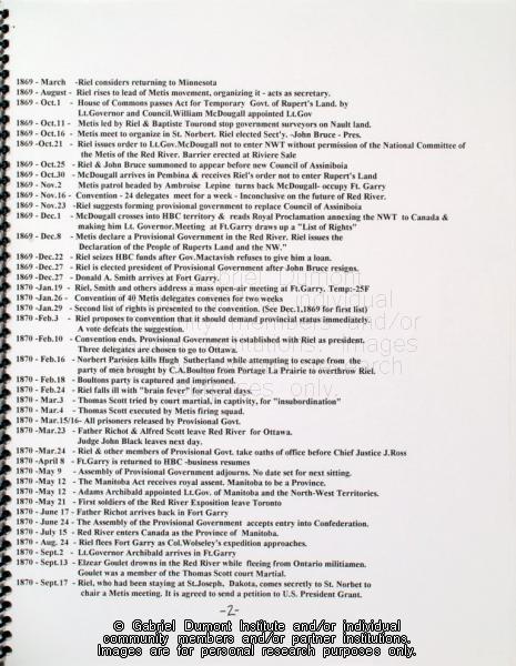 | Description: | In this image, Dennis Fisher provides a chronology on the life of Louis Riel. In 1999, Dennis Fisher put together this album and entitled it the ``Gabriel Dumont Album.`` The album largely focuses on items relating to Gabriel Dumont such as Dennis and Bill Epp`s correspondence regarding the creation of the Gabriel Dumont statue, Dennis`s finding of a ``lost`` image of Gabriel Dumont at the Buffalo Bill Cody Museum in Wyoming, information relating to an image of Dumont in a Wild West show program; a document in which Dumont attempts to write his name, a chronology of Dumont`s life, a program relating to the closing of Gabriel`s Ferry, various images relating the Commemorate `85 Celebrations in Saskatoon which honoured Gabriel Dumont, as well as facsimiles of Dumont`s stamp, and a pamphlet by Agriculture Canada promoting ``Dumont Oats.`` Other items relate to Madeleine Dumont`s grave in Montana as well as information about Louis Riel including a timeline of his life, and information relating to the acquisition of his diary by Dennis Fisher and Eugène Rhéaume.