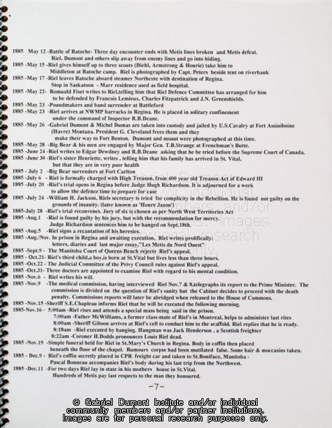 | Description: | In this image, Dennis Fisher provides a chronology on the life of Louis Riel. In 1999, Dennis Fisher put together this album and entitled it the ``Gabriel Dumont Album.`` The album largely focuses on items relating to Gabriel Dumont such as Dennis and Bill Epp`s correspondence regarding the creation of the Gabriel Dumont statue, Dennis`s finding of a ``lost`` image of Gabriel Dumont at the Buffalo Bill Cody Museum in Wyoming, information relating to an image of Dumont in a Wild West show program; a document in which Dumont attempts to write his name, a chronology of Dumont`s life, a program relating to the closing of Gabriel`s Ferry, various images relating the Commemorate `85 Celebrations in Saskatoon which honoured Gabriel Dumont, as well as facsimiles of Dumont`s stamp, and a pamphlet by Agriculture Canada promoting ``Dumont Oats.`` Other items relate to Madeleine Dumont`s grave in Montana as well as information about Louis Riel including a timeline of his life, and information relating to the acquisition of his diary by Dennis Fisher and Eugène Rhéaume.