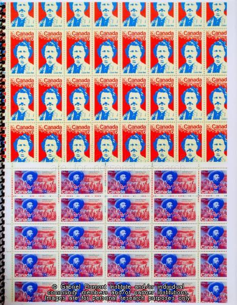 | Description: | This image contains both a panel of Louis Riel stamps from 1970 and Gabriel Dumont stamps from 1985. In 1999, Dennis Fisher put together this album and entitled it the ``Gabriel Dumont Album.`` The album largely focuses on items relating to Gabriel Dumont such as Dennis and Bill Epp`s correspondence regarding the creation of the Gabriel Dumont statue, Dennis`s finding of a ``lost`` image of Gabriel Dumont at the Buffalo Bill Cody Museum in Wyoming, information relating to an image of Dumont in a Wild West show program; a document in which Dumont attempts to write his name, a chronology of Dumont`s life, a program relating to the closing of Gabriel`s Ferry, various images relating the Commemorate `85 Celebrations in Saskatoon which honoured Gabriel Dumont, as well as facsimiles of Dumont`s stamp, and a pamphlet by Agriculture Canada promoting ``Dumont Oats.`` Other items relate to Madeleine Dumont`s grave in Montana as well as information about Louis Riel including a timeline of his life, and information relating to the acquisition of his diary by Dennis Fisher and Eugène Rhéaume.