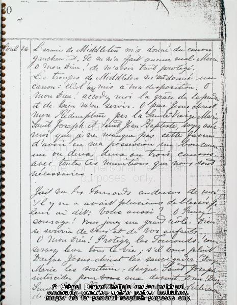 | Description: | This image is an actual photocopy of the original Louis Riel diary in which Riel documents his surrender to General Middleton. In 1999, Dennis Fisher put together this album and entitled it the ``Gabriel Dumont Album.`` The album largely focuses on items relating to Gabriel Dumont such as Dennis and Bill Epp`s correspondence regarding the creation of the Gabriel Dumont statue, Dennis`s finding of a ``lost`` image of Gabriel Dumont at the Buffalo Bill Cody Museum in Wyoming, information relating to an image of Dumont in a Wild West show program; a document in which Dumont attempts to write his name, a chronology of Dumont`s life, a program relating to the closing of Gabriel`s Ferry, various images relating the Commemorate `85 Celebrations in Saskatoon which honoured Gabriel Dumont, as well as facsimiles of Dumont`s stamp, and a pamphlet by Agriculture Canada promoting ``Dumont Oats.`` Other items relate to Madeleine Dumont`s grave in Montana as well as information about Louis Riel including a timeline of his life, and information relating to the acquisition of his diary by Dennis Fisher and Eugène Rhéaume.