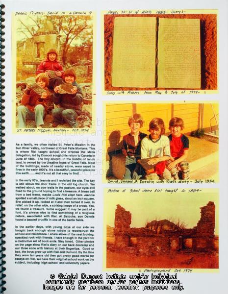 | Description: | In this image, Dennis Fisher discusses going to St. Peter`s Mission in Montana, where Louis Riel taught school in the early 1880s, with his family in the 1970s, and he discusses when he and his family possessed the Louis Riel dairy from May to July, 1974. This image also includes images of Dennis Fisher`s sons—Dennis, Davis, and Darwin—in 1974. In 1999, Dennis Fisher put together this album and entitled it the ``Gabriel Dumont Album.`` The album largely focuses on items relating to Gabriel Dumont such as Dennis and Bill Epp`s correspondence regarding the creation of the Gabriel Dumont statue, Dennis`s finding of a ``lost`` image of Gabriel Dumont at the Buffalo Bill Cody Museum in Wyoming, information relating to an image of Dumont in a Wild West show program; a document in which Dumont attempts to write his name, a chronology of Dumont`s life, a program relating to the closing of Gabriel`s Ferry, various images relating the Commemorate `85 Celebrations in Saskatoon which honoured Gabriel Dumont, as well as facsimiles of Dumont`s stamp, and a pamphlet by Agriculture Canada promoting ``Dumont Oats.`` Other items relate to Madeleine Dumont`s grave in Montana as well as information about Louis Riel including a timeline of his life, and information relating to the acquisition of his diary by Dennis Fisher and Eugène Rhéaume.