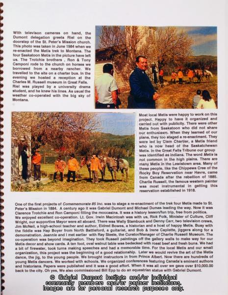In this image, Dennis Fisher discusses his efforts in 1984 to have a re-enactment of Gabriel Dumont, Michel Dumas, and James Isbister ‘s delegation to St. Peter`s, Montana which attempted to persuade Louis Riel to come to Batoche to lead the fight for Métis and Half-breed rights in 1884. Two smaller images show the historical re-enactment. In 1999, Dennis Fisher put together this album and entitled it the ``Gabriel Dumont Album.`` The album largely focuses on items relating to Gabriel Dumont such as Dennis and Bill Epp`s correspondence regarding the creation of the Gabriel Dumont statue, Dennis`s finding of a ``lost`` image of Gabriel Dumont at the Buffalo Bill Cody Museum in Wyoming, information relating to an image of Dumont in a Wild West show program; a document in which Dumont attempts to write his name, a chronology of Dumont`s life, a program relating to the closing of Gabriel`s Ferry, various images relating the Commemorate `85 Celebrations in Saskatoon which honoured Gabriel Dumont, as well as facsimiles of Dumont`s stamp, and a pamphlet by Agriculture Canada promoting ``Dumont Oats.`` Other items relate to Madeleine Dumont`s grave in Montana as well as information about Louis Riel including a timeline of his life, and information relating to the acquisition of his diary by Dennis Fisher and Eugène Rhéaume. |