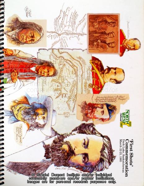 | Description: | This image is the front cover of a commemorative brochure handed out to celebrate the 100th anniversary of the Battle of Duck Lake on March 26, 1885. In 1999, Dennis Fisher put together this album and entitled it the ``Gabriel Dumont Album.`` The album largely focuses on items relating to Gabriel Dumont such as Dennis and Bill Epp`s correspondence regarding the creation of the Gabriel Dumont statue, Dennis`s finding of a ``lost`` image of Gabriel Dumont at the Buffalo Bill Cody Museum in Wyoming, information relating to an image of Dumont in a Wild West show program; a document in which Dumont attempts to write his name, a chronology of Dumont`s life, a program relating to the closing of Gabriel`s Ferry, various images relating the Commemorate `85 Celebrations in Saskatoon which honoured Gabriel Dumont, as well as facsimiles of Dumont`s stamp, and a pamphlet by Agriculture Canada promoting ``Dumont Oats.`` Other items relate to Madeleine Dumont`s grave in Montana as well as information about Louis Riel including a timeline of his life, and information relating to the acquisition of his diary by Dennis Fisher and Eugène Rhéaume.