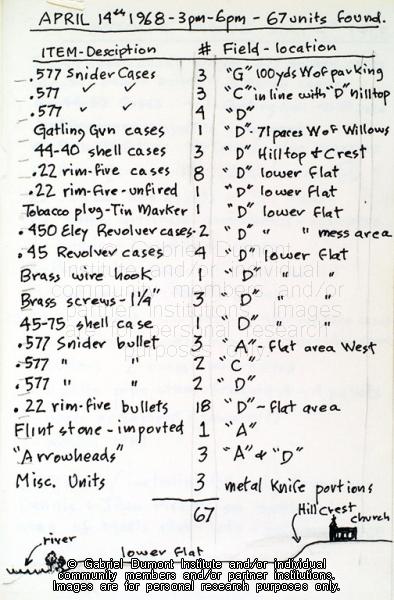 In this page from his sketchbook, Dennis Fisher outlines some of the artifacts which he his wife and their three sons found on the Batoche battlefield in 1968. Dennis Fisher sketched the images in the sketchbook in the late 1970s, although one image sketched in 2008. During the 1960s and `70s, Dennis and Jean Fisher and their three sons visited various archaeological sites in Saskatchewan and Montana, and collected hundreds of artifacts relating to Métis history. Overtime, Dennis, a trained draftsperson, sketched many of these finds in this sketchbook, which relate to the 1885 battlefields at Batoche and Fish Creek (Tourond`s Coulee), Gabriel (Dumont)`s Crossing near Batoche, fur trade posts at Fort Carlton at Fort Pitt, and US military forts such as Fort Assinniboine near Havre, Montana. This sketchbook is part of the Dennis and Jean Fisher Collection. This collection contains archaeological artifacts taken from the battlefields of the 1885 Resistance as well as Fort Pitt (Saskatchewan), Cumberland House (Saskatchewan), and St. Peter`s Mission, Montana. The collection also includes various artifacts and ephemera relating to the 1885 Resistance and Gabriel Dumont.