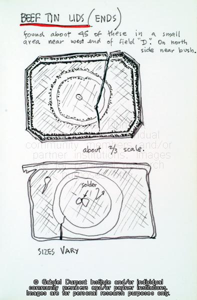 In this page from his sketchbook, Dennis Fisher sketched two beef tin lids that he his wife and their three sons found on field ``D`` at the Batoche battlefield in 1968. Dennis Fisher sketched the images in the sketchbook in the late 1970s, although one image sketched in 2008. During the 1960s and `70s, Dennis and Jean Fisher and their three sons visited various archaeological sites in Saskatchewan and Montana, and collected hundreds of artifacts relating to Métis history. Overtime, Dennis, a trained draftsperson, sketched many of these finds in this sketchbook, which relate to the 1885 battlefields at Batoche and Fish Creek (Tourond`s Coulee), Gabriel (Dumont)`s Crossing near Batoche, fur trade posts at Fort Carlton at Fort Pitt, and US military forts such as Fort Assinniboine near Havre, Montana. This sketchbook is part of the Dennis and Jean Fisher Collection. This collection contains archaeological artifacts taken from the battlefields of the 1885 Resistance as well as Fort Pitt (Saskatchewan), Cumberland House (Saskatchewan), and St. Peter`s Mission, Montana. The collection also includes various artifacts and ephemera relating to the 1885 Resistance and Gabriel Dumont.