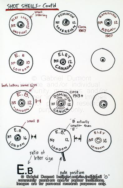 In this page from his sketchbook, Dennis Fisher sketched various 12 gauge shoot gun had stamps. Dennis Fisher sketched the images in the sketchbook in the late 1970s, although one image sketched in 2008. During the 1960s and `70s, Dennis and Jean Fisher and their three sons visited various archaeological sites in Saskatchewan and Montana, and collected hundreds of artifacts relating to Métis history. Overtime, Dennis, a trained draftsperson, sketched many of these finds in this sketchbook, which relate to the 1885 battlefields at Batoche and Fish Creek (Tourond`s Coulee), Gabriel (Dumont)`s Crossing near Batoche, fur trade posts at Fort Carlton at Fort Pitt, and US military forts such as Fort Assinniboine near Havre, Montana. This sketchbook is part of the Dennis and Jean Fisher Collection. This collection contains archaeological artifacts taken from the battlefields of the 1885 Resistance as well as Fort Pitt (Saskatchewan), Cumberland House (Saskatchewan), and St. Peter`s Mission, Montana. The collection also includes various artifacts and ephemera relating to the 1885 Resistance and Gabriel Dumont.