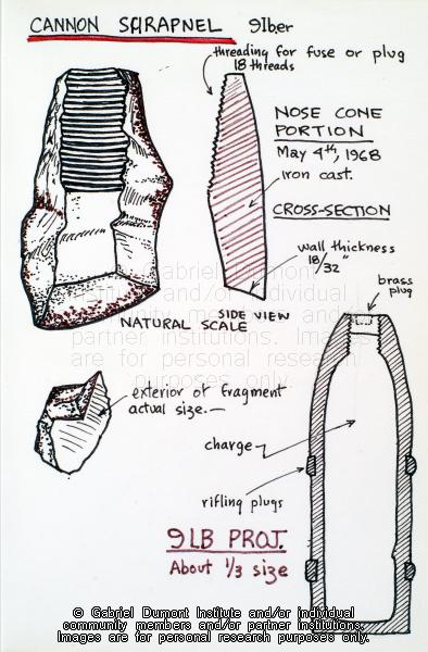 In this page from his sketchbook, Dennis Fisher sketched a 9 pounder cannon shell fragment that he his wife and their three sons found on the Batoche battlefield in 1968. Dennis Fisher sketched the images in the sketchbook in the late 1970s, although one image sketched in 2008. During the 1960s and `70s, Dennis and Jean Fisher and their three sons visited various archaeological sites in Saskatchewan and Montana, and collected hundreds of artifacts relating to Métis history. Overtime, Dennis, a trained draftsperson, sketched many of these finds in this sketchbook, which relate to the 1885 battlefields at Batoche and Fish Creek (Tourond`s Coulee), Gabriel (Dumont)`s Crossing near Batoche, fur trade posts at Fort Carlton at Fort Pitt, and US military forts such as Fort Assinniboine near Havre, Montana. This sketchbook is part of the Dennis and Jean Fisher Collection. This collection contains archaeological artifacts taken from the battlefields of the 1885 Resistance as well as Fort Pitt (Saskatchewan), Cumberland House (Saskatchewan), and St. Peter`s Mission, Montana. The collection also includes various artifacts and ephemera relating to the 1885 Resistance and Gabriel Dumont.