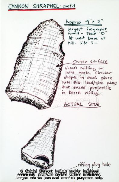 In this page from his sketchbook, Dennis Fisher sketched a 9 pounder cannon shell fragment that he his wife and their three sons found on the Batoche battlefield in 1968. Dennis Fisher sketched the images in the sketchbook in the late 1970s, although one image sketched in 2008. During the 1960s and `70s, Dennis and Jean Fisher and their three sons visited various archaeological sites in Saskatchewan and Montana, and collected hundreds of artifacts relating to Métis history. Overtime, Dennis, a trained draftsperson, sketched many of these finds in this sketchbook, which relate to the 1885 battlefields at Batoche and Fish Creek (Tourond`s Coulee), Gabriel (Dumont)`s Crossing near Batoche, fur trade posts at Fort Carlton at Fort Pitt, and US military forts such as Fort Assinniboine near Havre, Montana. This sketchbook is part of the Dennis and Jean Fisher Collection. This collection contains archaeological artifacts taken from the battlefields of the 1885 Resistance as well as Fort Pitt (Saskatchewan), Cumberland House (Saskatchewan), and St. Peter`s Mission, Montana. The collection also includes various artifacts and ephemera relating to the 1885 Resistance and Gabriel Dumont.