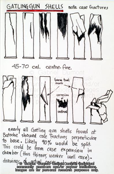 In this page from his sketchbook, Dennis Fisher sketched examples of Gatling Gun shells and various centre-fire shell casings that he his wife and their three sons found on the Batoche battlefield in 1968. Dennis Fisher sketched the images in the sketchbook in the late 1970s, although one image sketched in 2008. During the 1960s and `70s, Dennis and Jean Fisher and their three sons visited various archaeological sites in Saskatchewan and Montana, and collected hundreds of artifacts relating to Métis history. Overtime, Dennis, a trained draftsperson, sketched many of these finds in this sketchbook, which relate to the 1885 battlefields at Batoche and Fish Creek (Tourond`s Coulee), Gabriel (Dumont)`s Crossing near Batoche, fur trade posts at Fort Carlton at Fort Pitt, and US military forts such as Fort Assinniboine near Havre, Montana. This sketchbook is part of the Dennis and Jean Fisher Collection. This collection contains archaeological artifacts taken from the battlefields of the 1885 Resistance as well as Fort Pitt (Saskatchewan), Cumberland House (Saskatchewan), and St. Peter`s Mission, Montana. The collection also includes various artifacts and ephemera relating to the 1885 Resistance and Gabriel Dumont. |