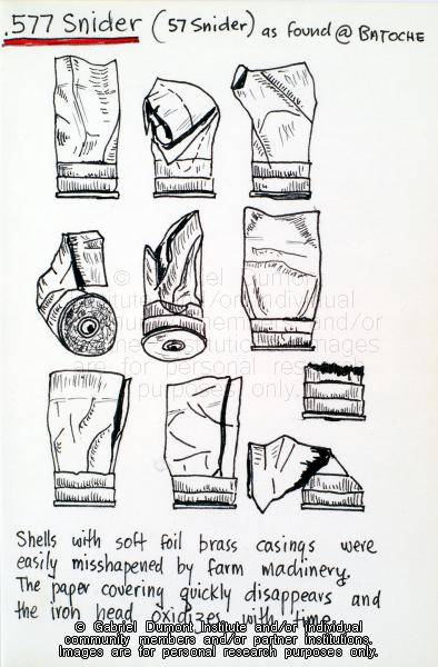 Description: In this page from his sketchbook, Dennis Fisher sketched examples of .577 Snider shell casings that that he his wife and their three sons found on the Batoche battlefield in 1968. Dennis Fisher sketched the images in the sketchbook in the late 1970s, although one image sketched in 2008. During the 1960s and `70s, Dennis and Jean Fisher and their three sons visited various archaeological sites in Saskatchewan and Montana, and collected hundreds of artifacts relating to Métis history. Overtime, Dennis, a trained draftsperson, sketched many of these finds in this sketchbook, which relate to the 1885 battlefields at Batoche and Fish Creek (Tourond`s Coulee), Gabriel (Dumont)`s Crossing near Batoche, fur trade posts at Fort Carlton at Fort Pitt, and US military forts such as Fort Assinniboine near Havre, Montana. This sketchbook is part of the Dennis and Jean Fisher Collection. This collection contains archaeological artifacts taken from the battlefields of the 1885 Resistance as well as Fort Pitt (Saskatchewan), Cumberland House (Saskatchewan), and St. Peter`s Mission, Montana. The collection also includes various artifacts and ephemera relating to the 1885 Resistance and Gabriel Dumont.