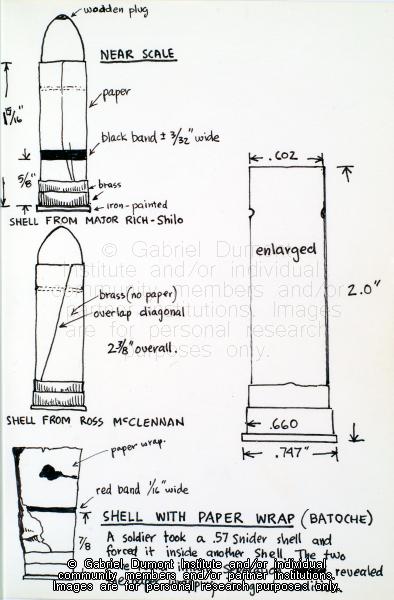 In this page from his sketchbook, Dennis Fisher sketched examples of .577 Snider shell casings that were found in Batoche from Major Rich of the Canadian Forces and Ross McClennan. Dennis Fisher sketched the images in the sketchbook in the late 1970s, although one image sketched in 2008. During the 1960s and `70s, Dennis and Jean Fisher and their three sons visited various archaeological sites in Saskatchewan and Montana, and collected hundreds of artifacts relating to Métis history. Overtime, Dennis, a trained draftsperson, sketched many of these finds in this sketchbook, which relate to the 1885 battlefields at Batoche and Fish Creek (Tourond`s Coulee), Gabriel (Dumont)`s Crossing near Batoche, fur trade posts at Fort Carlton at Fort Pitt, and US military forts such as Fort Assinniboine near Havre, Montana. This sketchbook is part of the Dennis and Jean Fisher Collection. This collection contains archaeological artifacts taken from the battlefields of the 1885 Resistance as well as Fort Pitt (Saskatchewan), Cumberland House (Saskatchewan), and St. Peter`s Mission, Montana. The collection also includes various artifacts and ephemera relating to the 1885 Resistance and Gabriel Dumont.