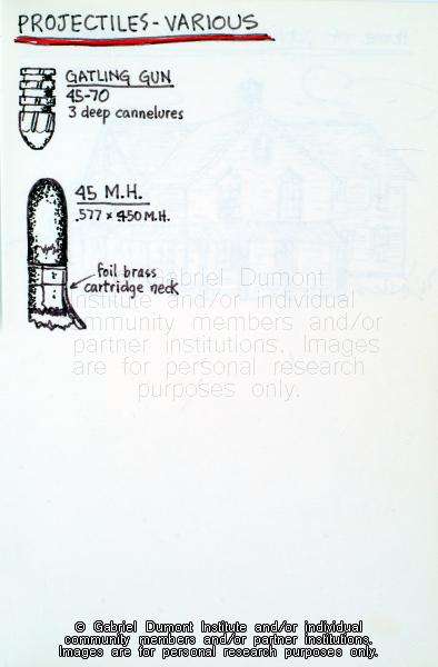 In this page from his sketchbook, Dennis Fisher sketched examples of Gatling Gun and .577 shell casings. Dennis Fisher sketched the images in the sketchbook in the late 1970s, although one image sketched in 2008. During the 1960s and `70s, Dennis and Jean Fisher and their three sons visited various archaeological sites in Saskatchewan and Montana, and collected hundreds of artifacts relating to Métis history. Overtime, Dennis, a trained draftsperson, sketched many of these finds in this sketchbook, which relate to the 1885 battlefields at Batoche and Fish Creek (Tourond`s Coulee), Gabriel (Dumont)`s Crossing near Batoche, fur trade posts at Fort Carlton at Fort Pitt, and US military forts such as Fort Assinniboine near Havre, Montana. This sketchbook is part of the Dennis and Jean Fisher Collection. This collection contains archaeological artifacts taken from the battlefields of the 1885 Resistance as well as Fort Pitt (Saskatchewan), Cumberland House (Saskatchewan), and St. Peter`s Mission, Montana. The collection also includes various artifacts and ephemera relating to the 1885 Resistance and Gabriel Dumont.