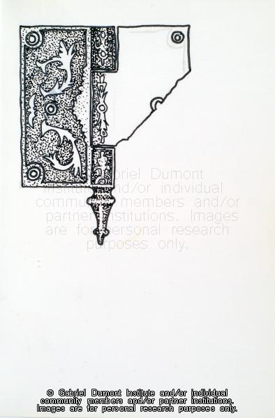 In this page from his sketchbook, Dennis Fisher sketched a door hinge that was part of Xavier Letendre dit Batoche`s home at Batoche that was found in field ``E`` at Batoche in the late 1960s or early 1970s. Dennis Fisher sketched the images in the sketchbook in the late 1970s, although one image sketched in 2008. During the 1960s and `70s, Dennis and Jean Fisher and their three sons visited various archaeological sites in Saskatchewan and Montana, and collected hundreds of artifacts relating to Métis history. Overtime, Dennis, a trained draftsperson, sketched many of these finds in this sketchbook, which relate to the 1885 battlefields at Batoche and Fish Creek (Tourond`s Coulee), Gabriel (Dumont)`s Crossing near Batoche, fur trade posts at Fort Carlton at Fort Pitt, and US military forts such as Fort Assinniboine near Havre, Montana. This sketchbook is part of the Dennis and Jean Fisher Collection. This collection contains archaeological artifacts taken from the battlefields of the 1885 Resistance as well as Fort Pitt (Saskatchewan), Cumberland House (Saskatchewan), and St. Peter`s Mission, Montana. The collection also includes various artifacts and ephemera relating to the 1885 Resistance and Gabriel Dumont.