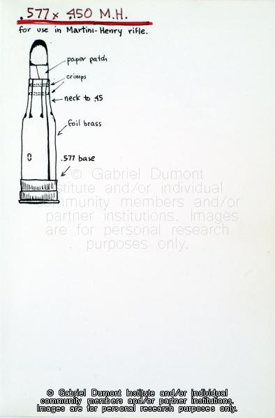 | Description: | In this page from his sketchbook, Dennis Fisher sketched a .577 shell that was used in a Martini-Henry Rifle.