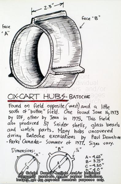 In this page from his sketchbook, Dennis Fisher sketched two oxcart or Red River cart hubs that he and his wife Jean found at Batoche in 1973 and 1973. Dennis Fisher sketched the images in the sketchbook in the late 1970s, although one image sketched in 2008. During the 1960s and `70s, Dennis and Jean Fisher and their three sons visited various archaeological sites in Saskatchewan and Montana, and collected hundreds of artifacts relating to Métis history. Overtime, Dennis, a trained draftsperson, sketched many of these finds in this sketchbook, which relate to the 1885 battlefields at Batoche and Fish Creek (Tourond`s Coulee), Gabriel (Dumont)`s Crossing near Batoche, fur trade posts at Fort Carlton at Fort Pitt, and US military forts such as Fort Assinniboine near Havre, Montana. This sketchbook is part of the Dennis and Jean Fisher Collection. This collection contains archaeological artifacts taken from the battlefields of the 1885 Resistance as well as Fort Pitt (Saskatchewan), Cumberland House (Saskatchewan), and St. Peter`s Mission, Montana. The collection also includes various artifacts and ephemera relating to the 1885 Resistance and Gabriel Dumont.