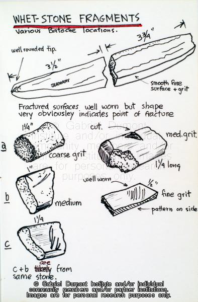 In this page from his sketchbook, Dennis Fisher sketched several whetstone fragments that he, his wife Jean and their sons collected at various fields at Batoche in the late 1960s or early `70s. Dennis Fisher sketched the images in the sketchbook in the late 1970s, although one image sketched in 2008. During the 1960s and `70s, Dennis and Jean Fisher and their three sons visited various archaeological sites in Saskatchewan and Montana, and collected hundreds of artifacts relating to Métis history. Overtime, Dennis, a trained draftsperson, sketched many of these finds in this sketchbook, which relate to the 1885 battlefields at Batoche and Fish Creek (Tourond`s Coulee), Gabriel (Dumont)`s Crossing near Batoche, fur trade posts at Fort Carlton at Fort Pitt, and US military forts such as Fort Assinniboine near Havre, Montana. This sketchbook is part of the Dennis and Jean Fisher Collection. This collection contains archaeological artifacts taken from the battlefields of the 1885 Resistance as well as Fort Pitt (Saskatchewan), Cumberland House (Saskatchewan), and St. Peter`s Mission, Montana. The collection also includes various artifacts and ephemera relating to the 1885 Resistance and Gabriel Dumont.