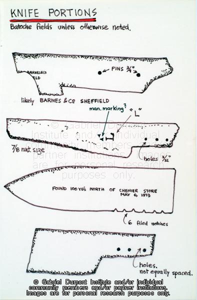 In this page from his sketchbook, Dennis Fisher sketched several portions of knives that he, his wife Jean and their sons collected at various fields at Batoche in 1973. Dennis Fisher sketched the images in the sketchbook in the late 1970s, although one image sketched in 2008. During the 1960s and `70s, Dennis and Jean Fisher and their three sons visited various archaeological sites in Saskatchewan and Montana, and collected hundreds of artifacts relating to Métis history. Overtime, Dennis, a trained draftsperson, sketched many of these finds in this sketchbook, which relate to the 1885 battlefields at Batoche and Fish Creek (Tourond`s Coulee), Gabriel (Dumont)`s Crossing near Batoche, fur trade posts at Fort Carlton at Fort Pitt, and US military forts such as Fort Assinniboine near Havre, Montana. This sketchbook is part of the Dennis and Jean Fisher Collection. This collection contains archaeological artifacts taken from the battlefields of the 1885 Resistance as well as Fort Pitt (Saskatchewan), Cumberland House (Saskatchewan), and St. Peter`s Mission, Montana. The collection also includes various artifacts and ephemera relating to the 1885 Resistance and Gabriel Dumont.