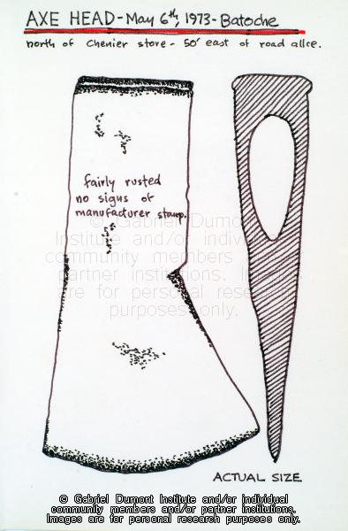 In this page from his sketchbook, Dennis Fisher sketched an axe head that he, his wife Jean and their sons collected north of the Chenier Store at Batoche in 1973. Dennis Fisher sketched the images in the sketchbook in the late 1970s, although one image sketched in 2008. During the 1960s and `70s, Dennis and Jean Fisher and their three sons visited various archaeological sites in Saskatchewan and Montana, and collected hundreds of artifacts relating to Métis history. Overtime, Dennis, a trained draftsperson, sketched many of these finds in this sketchbook, which relate to the 1885 battlefields at Batoche and Fish Creek (Tourond`s Coulee), Gabriel (Dumont)`s Crossing near Batoche, fur trade posts at Fort Carlton at Fort Pitt, and US military forts such as Fort Assinniboine near Havre, Montana. This sketchbook is part of the Dennis and Jean Fisher Collection. This collection contains archaeological artifacts taken from the battlefields of the 1885 Resistance as well as Fort Pitt (Saskatchewan), Cumberland House (Saskatchewan), and St. Peter`s Mission, Montana. The collection also includes various artifacts and ephemera relating to the 1885 Resistance and Gabriel Dumont.
