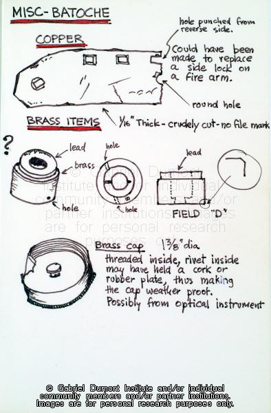 In this page from his sketchbook, Dennis Fisher sketched copper and brass items that he, his wife Jean and their sons collected at various fields at Batoche in the late 1960s or early `70s. Dennis Fisher sketched the images in the sketchbook in the late 1970s, although one image sketched in 2008. During the 1960s and `70s, Dennis and Jean Fisher and their three sons visited various archaeological sites in Saskatchewan and Montana, and collected hundreds of artifacts relating to Métis history. Overtime, Dennis, a trained draftsperson, sketched many of these finds in this sketchbook, which relate to the 1885 battlefields at Batoche and Fish Creek (Tourond`s Coulee), Gabriel (Dumont)`s Crossing near Batoche, fur trade posts at Fort Carlton at Fort Pitt, and US military forts such as Fort Assinniboine near Havre, Montana. This sketchbook is part of the Dennis and Jean Fisher Collection. This collection contains archaeological artifacts taken from the battlefields of the 1885 Resistance as well as Fort Pitt (Saskatchewan), Cumberland House (Saskatchewan), and St. Peter`s Mission, Montana. The collection also includes various artifacts and ephemera relating to the 1885 Resistance and Gabriel Dumont.