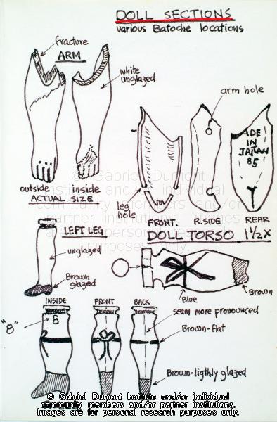 In this page from his sketchbook, Dennis Fisher sketched several doll fragments that he, his wife Jean and their sons collected at various fields at Batoche in the late 1960s or early `70s. Dennis Fisher sketched the images in the sketchbook in the late 1970s, although one image sketched in 2008. During the 1960s and `70s, Dennis and Jean Fisher and their three sons visited various archaeological sites in Saskatchewan and Montana, and collected hundreds of artifacts relating to Métis history. Overtime, Dennis, a trained draftsperson, sketched many of these finds in this sketchbook, which relate to the 1885 battlefields at Batoche and Fish Creek (Tourond`s Coulee), Gabriel (Dumont)`s Crossing near Batoche, fur trade posts at Fort Carlton at Fort Pitt, and US military forts such as Fort Assinniboine near Havre, Montana. This sketchbook is part of the Dennis and Jean Fisher Collection. This collection contains archaeological artifacts taken from the battlefields of the 1885 Resistance as well as Fort Pitt (Saskatchewan), Cumberland House (Saskatchewan), and St. Peter`s Mission, Montana. The collection also includes various artifacts and ephemera relating to the 1885 Resistance and Gabriel Dumont.