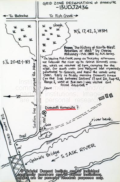 In this page from his sketchbook, Dennis Fisher sketched the site of Gabriel Dumont`s homestead site along the South Saskatchewan near Batoche. Dennis Fisher sketched the images in the sketchbook in the late 1970s, although one image sketched in 2008. During the 1960s and `70s, Dennis and Jean Fisher and their three sons visited various archaeological sites in Saskatchewan and Montana, and collected hundreds of artifacts relating to Métis history. Overtime, Dennis, a trained draftsperson, sketched many of these finds in this sketchbook, which relate to the 1885 battlefields at Batoche and Fish Creek (Tourond`s Coulee), Gabriel (Dumont)`s Crossing near Batoche, fur trade posts at Fort Carlton at Fort Pitt, and US military forts such as Fort Assinniboine near Havre, Montana. This sketchbook is part of the Dennis and Jean Fisher Collection. This collection contains archaeological artifacts taken from the battlefields of the 1885 Resistance as well as Fort Pitt (Saskatchewan), Cumberland House (Saskatchewan), and St. Peter`s Mission, Montana. The collection also includes various artifacts and ephemera relating to the 1885 Resistance and Gabriel Dumont.