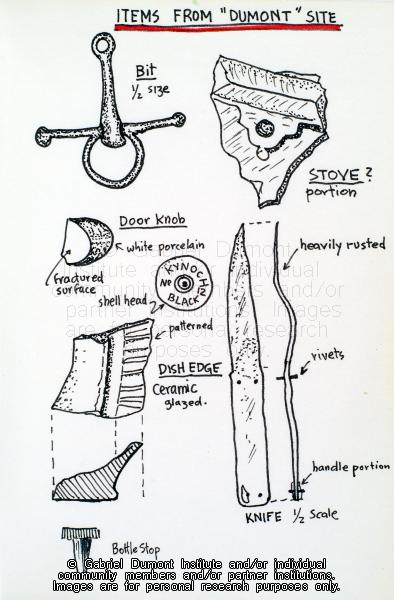 In this page from his sketchbook, Dennis Fisher sketched items found at the Gabriel Dumont site in the early 1970s. Dennis Fisher sketched the images in the sketchbook in the late 1970s, although one image sketched in 2008. During the 1960s and `70s, Dennis and Jean Fisher and their three sons visited various archaeological sites in Saskatchewan and Montana, and collected hundreds of artifacts relating to Métis history. Overtime, Dennis, a trained draftsperson, sketched many of these finds in this sketchbook, which relate to the 1885 battlefields at Batoche and Fish Creek (Tourond`s Coulee), Gabriel (Dumont)`s Crossing near Batoche, fur trade posts at Fort Carlton at Fort Pitt, and US military forts such as Fort Assinniboine near Havre, Montana. This sketchbook is part of the Dennis and Jean Fisher Collection. This collection contains archaeological artifacts taken from the battlefields of the 1885 Resistance as well as Fort Pitt (Saskatchewan), Cumberland House (Saskatchewan), and St. Peter`s Mission, Montana. The collection also includes various artifacts and ephemera relating to the 1885 Resistance and Gabriel Dumont.
