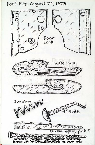 In this page from his sketchbook, Dennis Fisher sketched several artifacts that he, his wife Jean, and their sons collected at Fort Pitt in 1973. Dennis Fisher sketched the images in the sketchbook in the late 1970s, although one image sketched in 2008. During the 1960s and `70s, Dennis and Jean Fisher and their three sons visited various archaeological sites in Saskatchewan and Montana, and collected hundreds of artifacts relating to Métis history. Overtime, Dennis, a trained draftsperson, sketched many of these finds in this sketchbook, which relate to the 1885 battlefields at Batoche and Fish Creek (Tourond`s Coulee), Gabriel (Dumont)`s Crossing near Batoche, fur trade posts at Fort Carlton at Fort Pitt, and US military forts such as Fort Assinniboine near Havre, Montana. This sketchbook is part of the Dennis and Jean Fisher Collection. This collection contains archaeological artifacts taken from the battlefields of the 1885 Resistance as well as Fort Pitt (Saskatchewan), Cumberland House (Saskatchewan), and St. Peter`s Mission, Montana. The collection also includes various artifacts and ephemera relating to the 1885 Resistance and Gabriel Dumont.