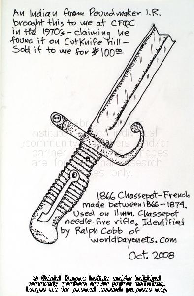 In this page from his sketchbook, Dennis Fisher sketched a bayonet fragment that he acquired from a First Nations man in the 1970s. The man told Dennis that he found the bayonet fragment at Cutknife Hill. Dennis Fisher sketched the images in the sketchbook in the late 1970s, although one image sketched in 2008. During the 1960s and `70s, Dennis and Jean Fisher and their three sons visited various archaeological sites in Saskatchewan and Montana, and collected hundreds of artifacts relating to Métis history. Overtime, Dennis, a trained draftsperson, sketched many of these finds in this sketchbook, which relate to the 1885 battlefields at Batoche and Fish Creek (Tourond`s Coulee), Gabriel (Dumont)`s Crossing near Batoche, fur trade posts at Fort Carlton at Fort Pitt, and US military forts such as Fort Assinniboine near Havre, Montana. This sketchbook is part of the Dennis and Jean Fisher Collection. This collection contains archaeological artifacts taken from the battlefields of the 1885 Resistance as well as Fort Pitt (Saskatchewan), Cumberland House (Saskatchewan), and St. Peter`s Mission, Montana. The collection also includes various artifacts and ephemera relating to the 1885 Resistance and Gabriel Dumont.