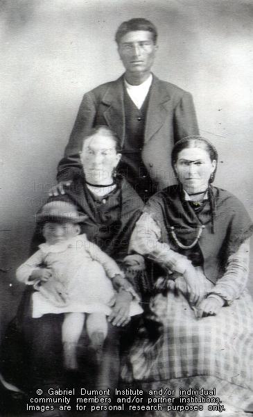 This image is of Joseph Laderoute (1855-1931) and Genevieve Dumas (1858-1923), an unknown child and Christine Dumas (1862-1954) . Source: Brenda Boyer-Percell. This image must not be reproduced. The original source of this image is Parks Canada. |