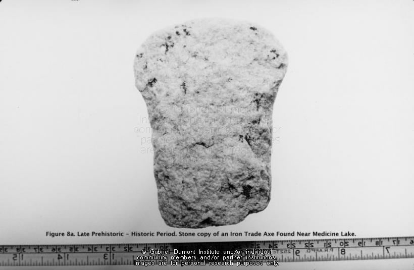 | Description: | Figures 8a, 8b. Late Prehistoric-Historic Period. Two views (underside and cortex side) of possible stone copy of an iron trade axe near Medicine Lake. From: Elliott 1970-71: 211.