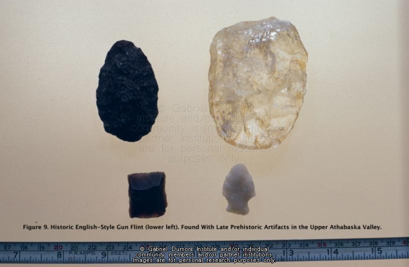| Description: | Figure 9. Historic Period English-style gun flint (lower left). Found with Late Prehistoric Period projectile point and bifaces in the Upper Athabasca Valley. From: Elliott 1970-71: 223.
