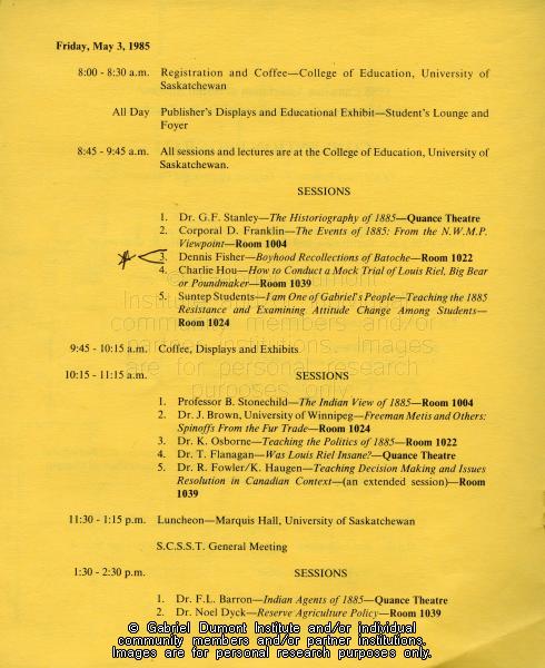 This image is a page of the ``Batoche and the Northwest Revisited: A Century of Search and Development `` Canadian Association of Social Studies/Saskatchewan Council of Social Studies Teachers Conference that was held in Saskatoon on May 2-4, 1985. This item was donated to the Institute by Dennis and Jean Fisher in 2011. This collection contains archaeological artifacts taken from the battlefields of the 1885 Resistance as well as Fort Pitt (Saskatchewan), Cumberland House (Saskatchewan) and St. Peter’s Mission, Montana. The collection also includes various artifacts and ephemera relating to the 1885 Resistance and Gabriel Dumont. |