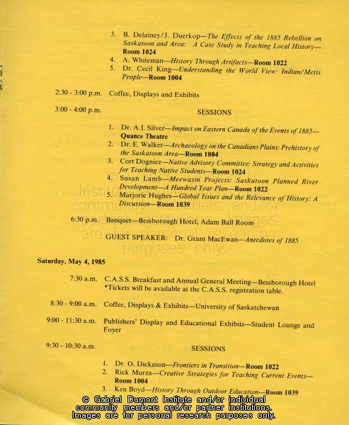 This image is a page of the ``Batoche and the Northwest Revisited: A Century of Search and Development `` Canadian Association of Social Studies/Saskatchewan Council of Social Studies Teachers Conference that was held in Saskatoon on May 2-4, 1985. This item was donated to the Institute by Dennis and Jean Fisher in 2011. This collection contains archaeological artifacts taken from the battlefields of the 1885 Resistance as well as Fort Pitt (Saskatchewan), Cumberland House (Saskatchewan) and St. Peter’s Mission, Montana. The collection also includes various artifacts and ephemera relating to the 1885 Resistance and Gabriel Dumont. |